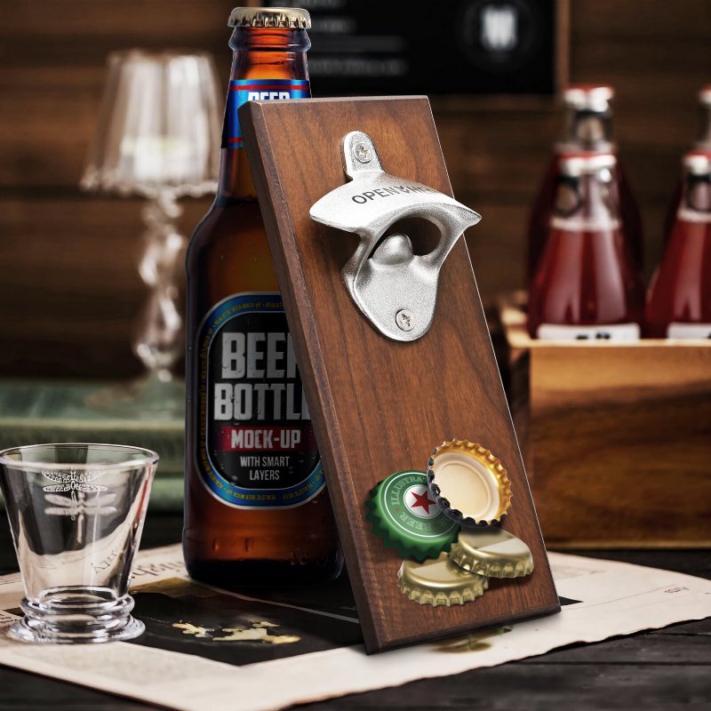 【Magnetisk Öppnare】 Flasköppnaren Är Gjord Av Rostfritt Stål Och Ansluten Till En Hård Furutillverkad Tavla I Vilken En Kraftfull Magnet Satts In. Sätt Bara Din Flaska På Öppnaren Och Fäll Av Toppen, Locket Kommer Att Attraheras Starkt Av Magneten, Spara Dina Problem Med Att Hantera Det.